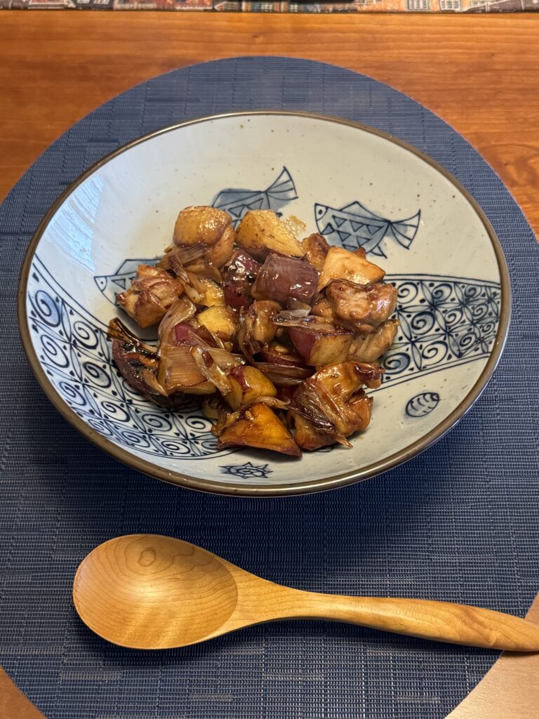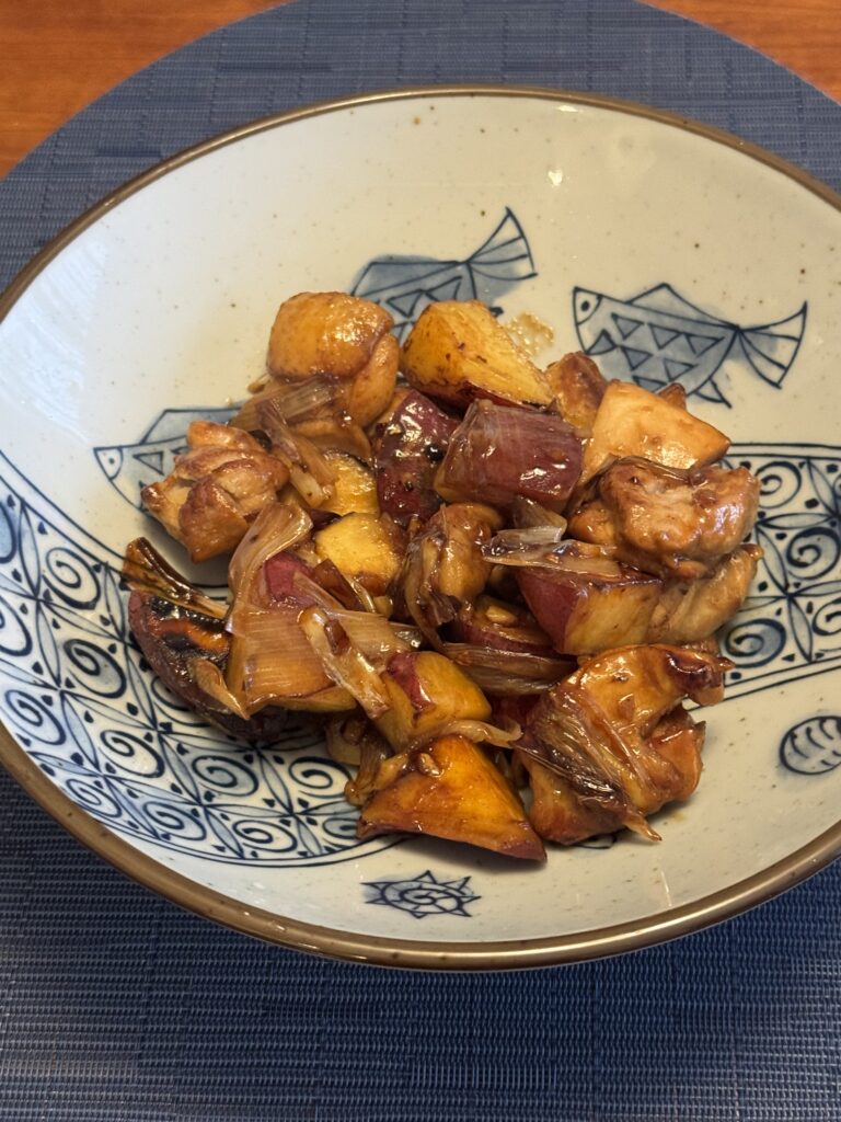 今回のアレンジは、一旦さつまいもを炒め焼きしておいて取り出し、後で再投入するやり方 これをやると煮崩れが防げて、甘い味とホクホクした食感を楽しむことができました