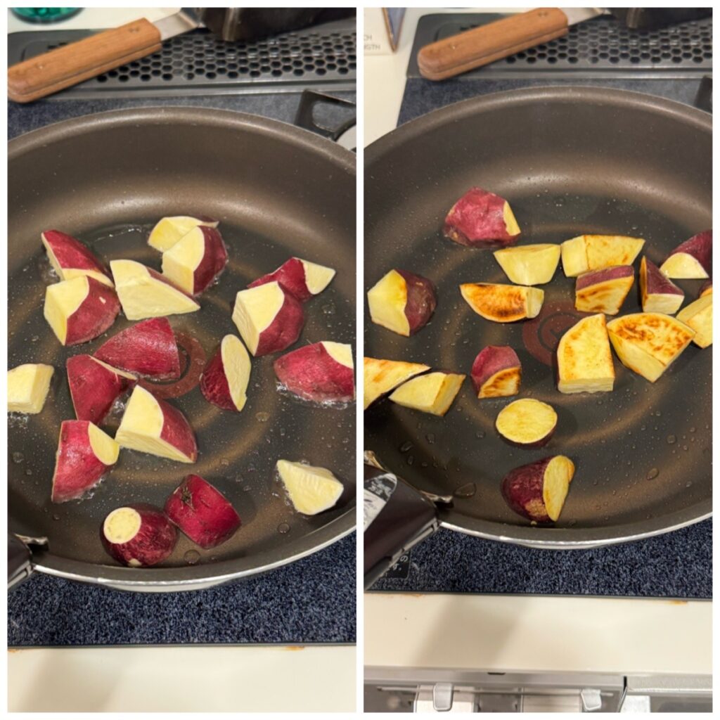 5分ほど水にさらしたさつまいもをひと口大に切り、フライパンで5分ほど炒めます