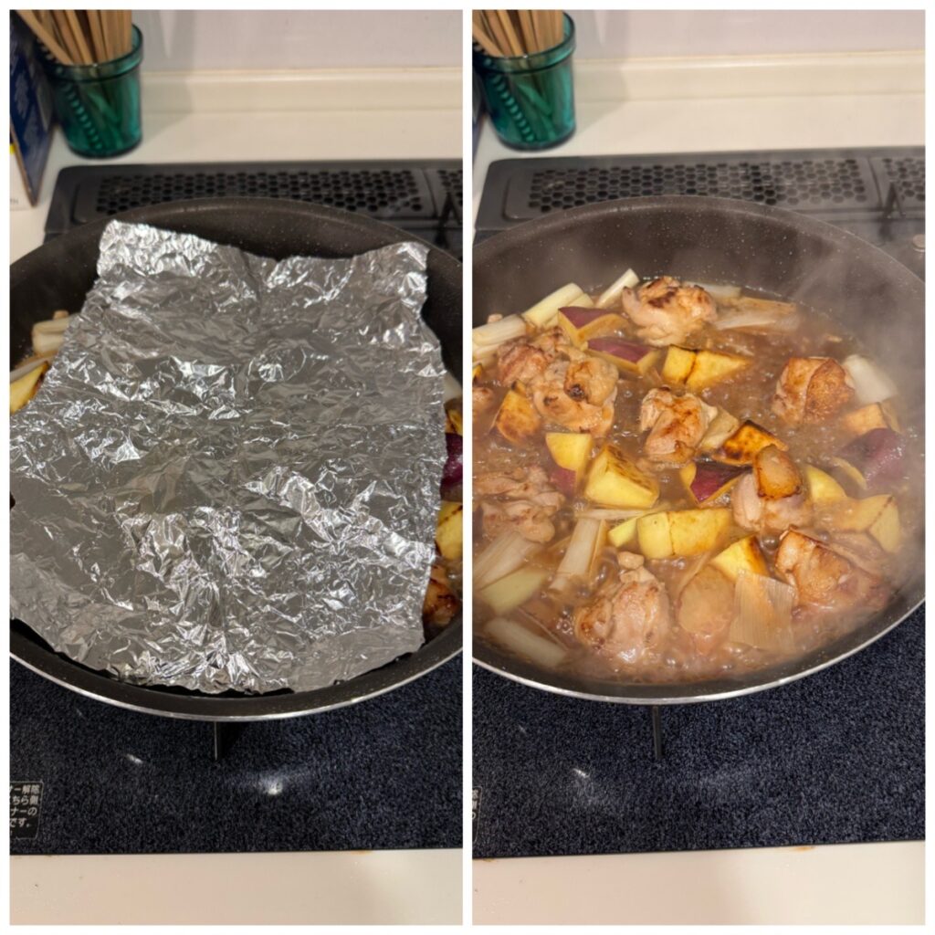 下味をつけた鶏肉を炒め、さつまいもを戻し、ネギと調味料を入れたら、落とし蓋をして煮ます 15分くらい煮たら、煮汁がなくなるので、なくなる直前に大きく混ぜたら出来上がりです