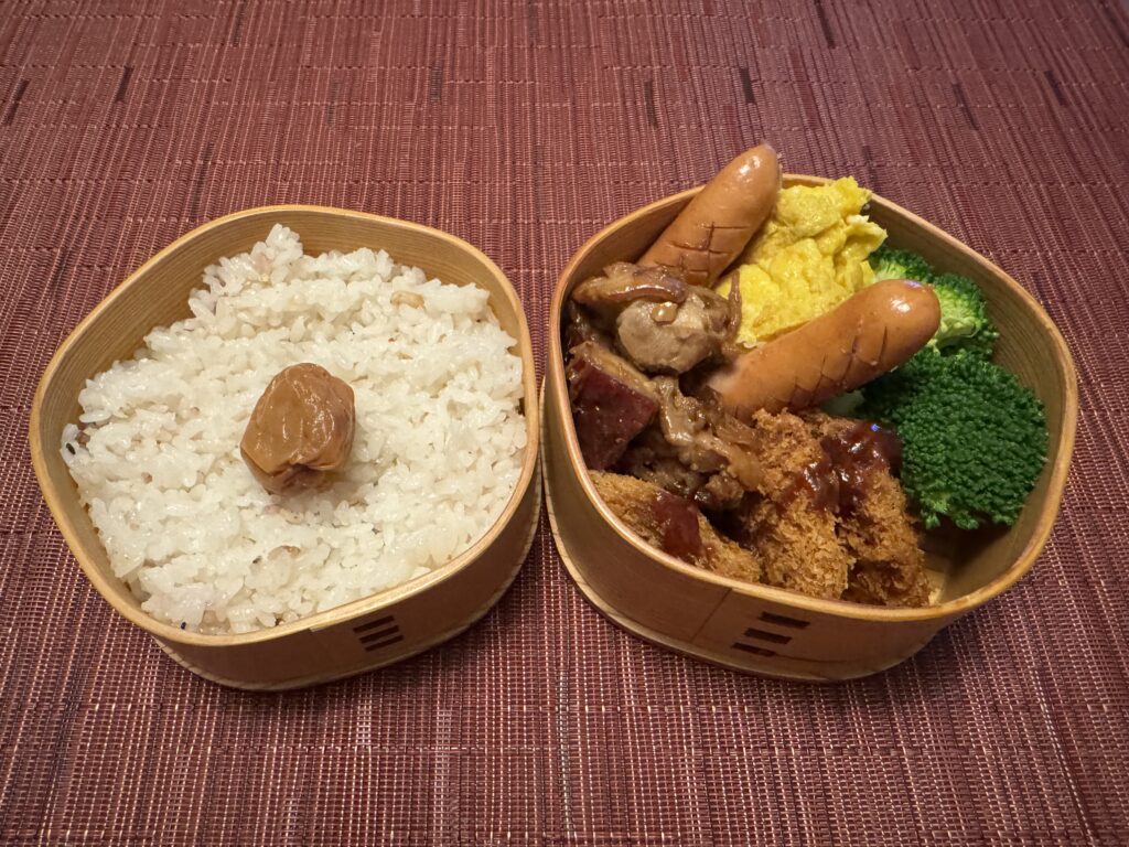 弁当には、ブロッコリーや一口カツ、玉子焼き、ソーセージと一緒に入れました 前日のおかずの残りを弁当に入れるのが最近の定番になっています
