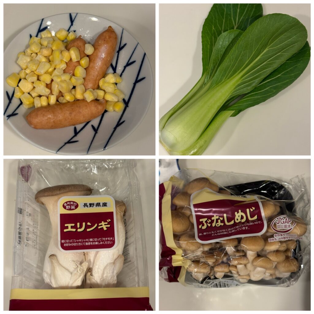 右下 鳥を焼く最終工程時に、同期をとって付け合わせを炒めます 最初にソーセージとコーンを炒め、キノコを加え、青梗菜を入れて、全体を炒めます