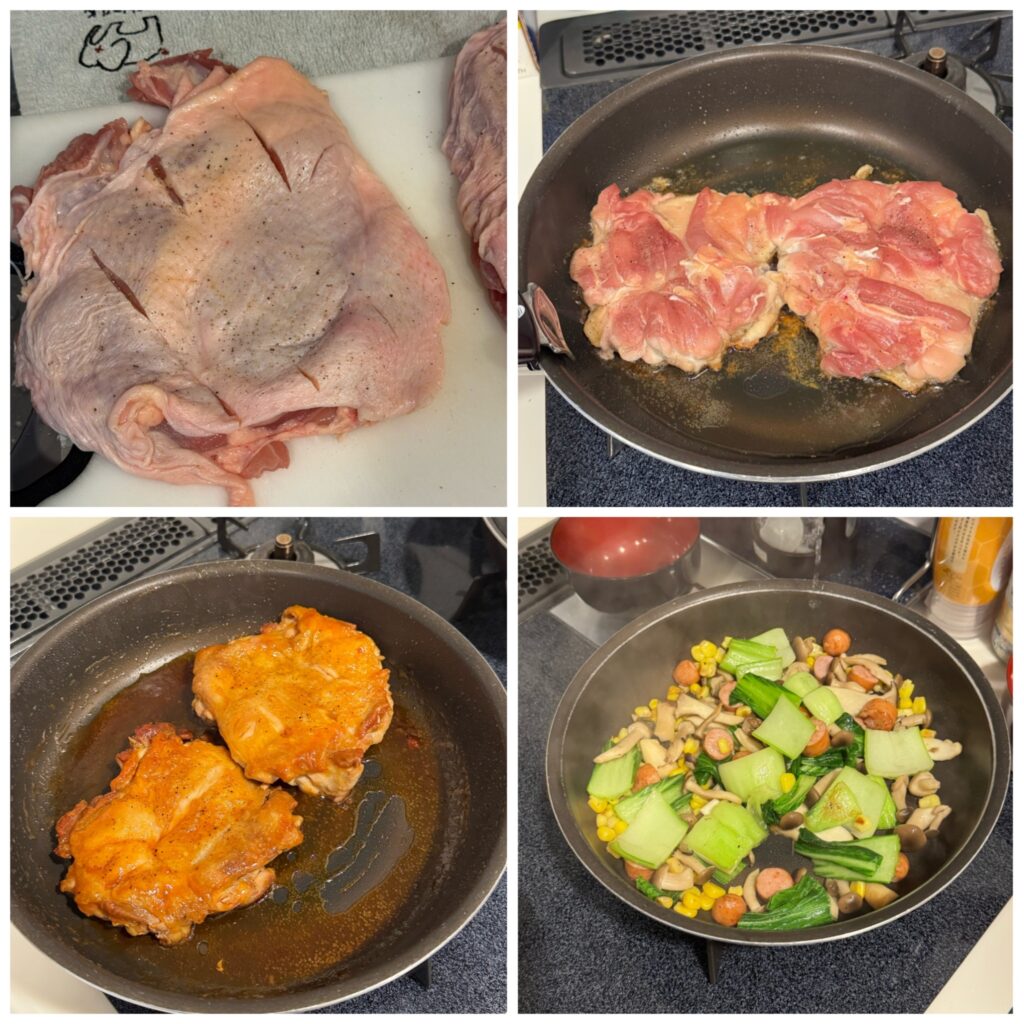 鶏肉と付け合わせの調理です