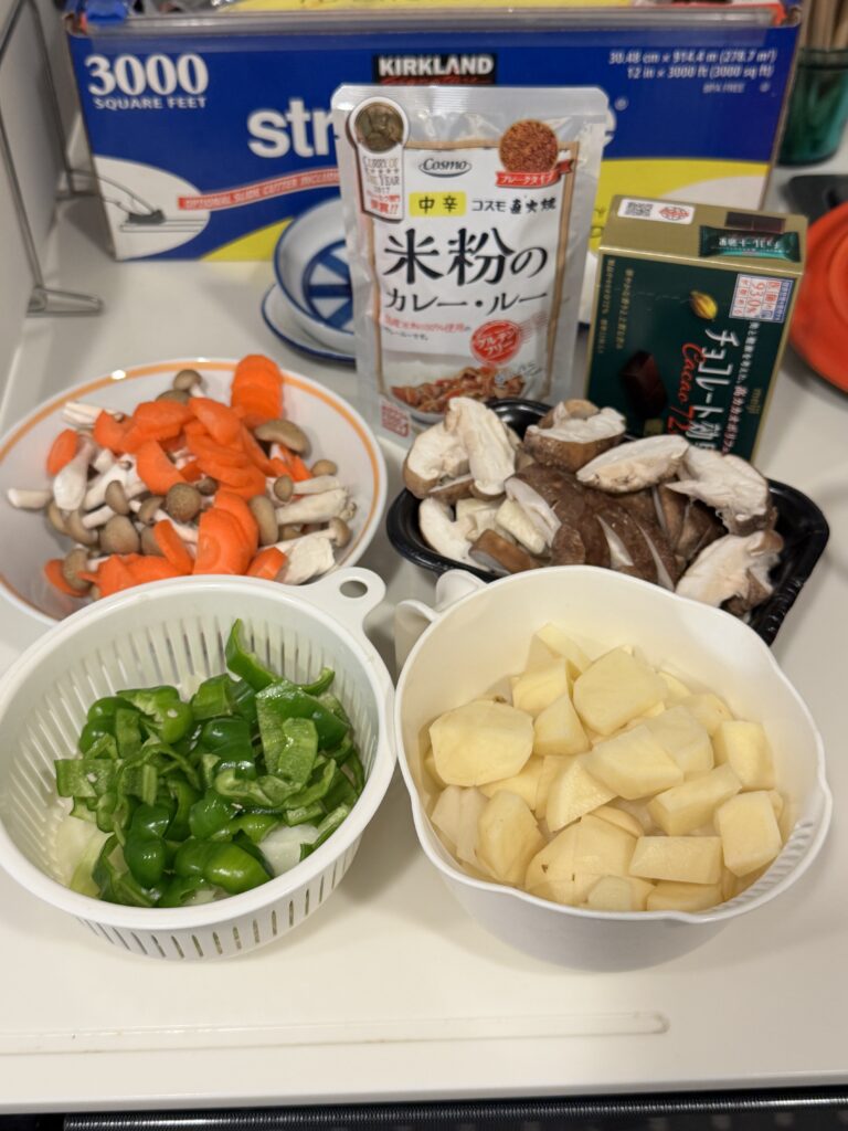 ピーマン🫑3ケ 玉ねぎ1ケ にんじん🥕半分 しめじ1ケ エリンギ2ケ 椎茸5ケ ジャガイモ2ケ きのこを除いて、それぞれを細切りか半口大に切り揃えて準備します