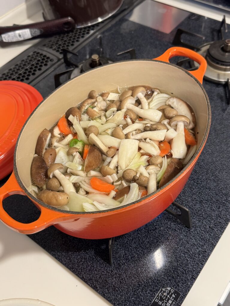 普段であれば、丁寧に飴色になるレベルまで玉ねぎを油で炒め、各野菜をサラダ油で炒めたのちに煮始めますが、炒めることなくだし汁に投入していきなり煮始めます