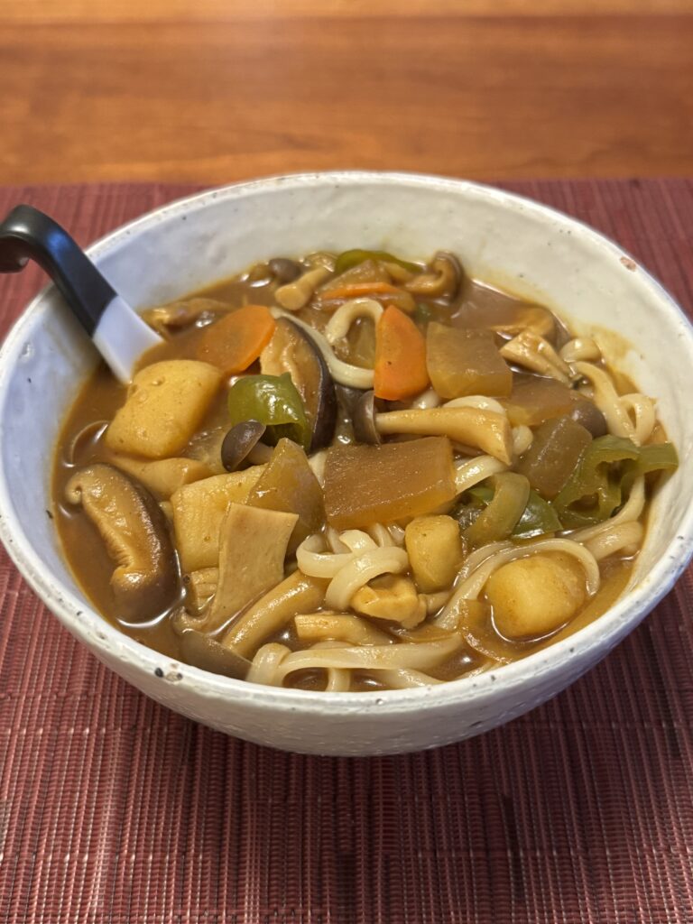 翌日、残ったカレーを温め直して茹でた冷凍うどんにかけて、カレーうどんにしました