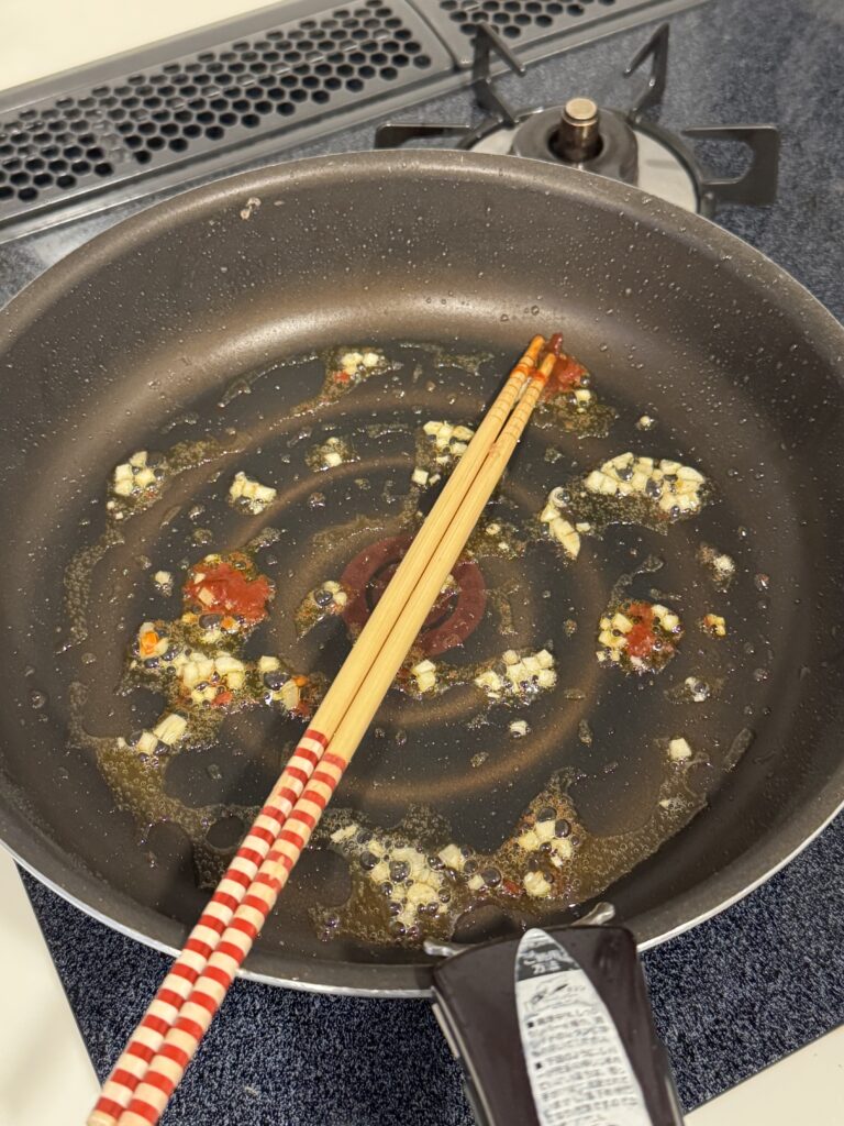 肉を炒めた油をそのままにニンニクのみじん切りと豆板醤を炒めます