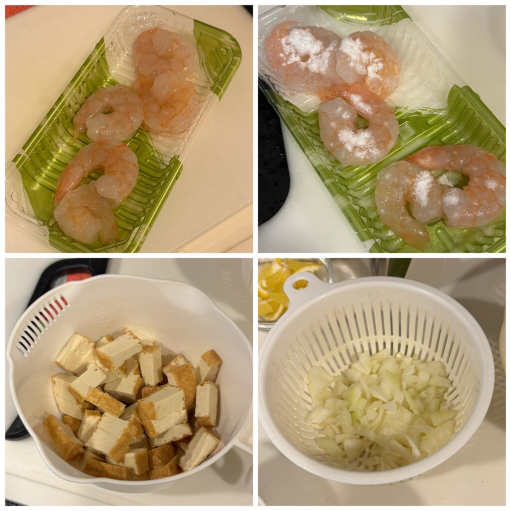 上段 最近のエビは背わたが取ってあったり至れり尽くせりですが、生臭くならないようにした処理します まずは、塩を振って10分ほどおき、塩を洗い流して酒を振ります その後、5分くらいで酒を流し、炒める準備をします