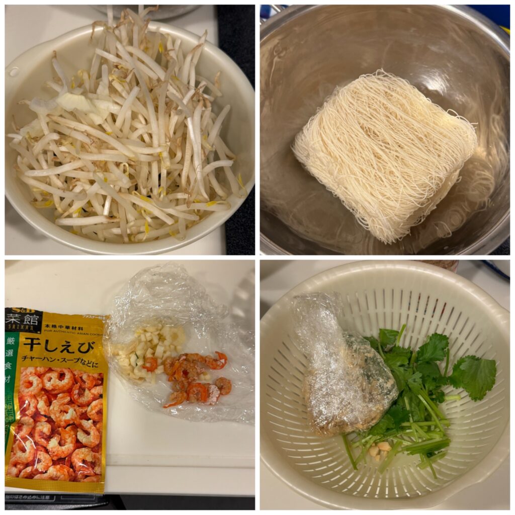 ・ライスバーミセリ(ビーフン)に熱湯を加えほぐしながら3分置きます ふやけたらザルにとり、固まらないようにサラダ油をかけて再度ほぐしておきます