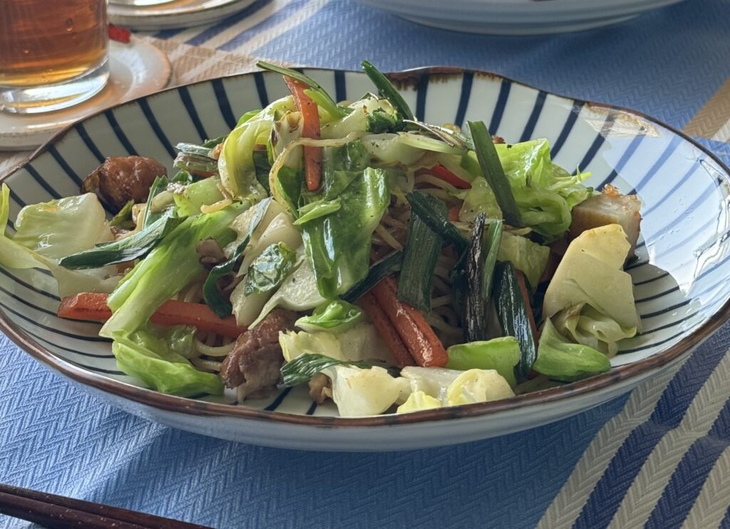 ベランダで食べる焼きそばランチ 焼きそばが見えないくらい野菜が載っていますが、家で作る妙味は食材を贅沢に使えることですね