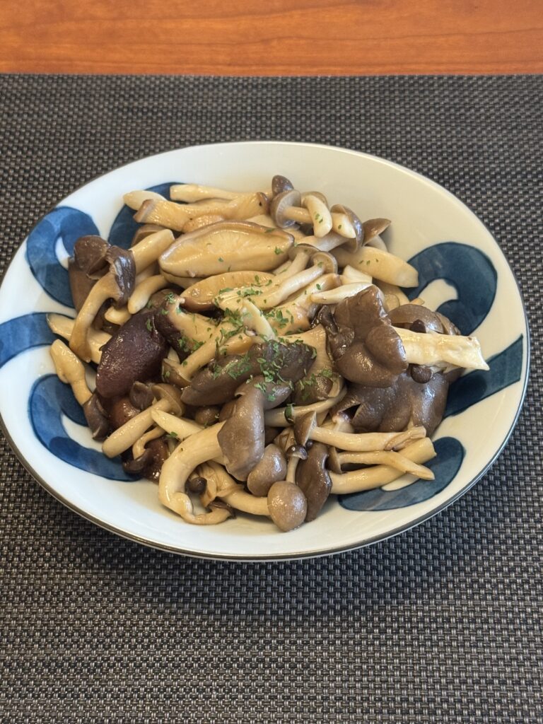 手前にあるのは、キノコの醤油焼き スーパーで、平茸、椎茸、ぶなしめじがセット販売されていたので、ラザニアの付け合わせにしてみました
