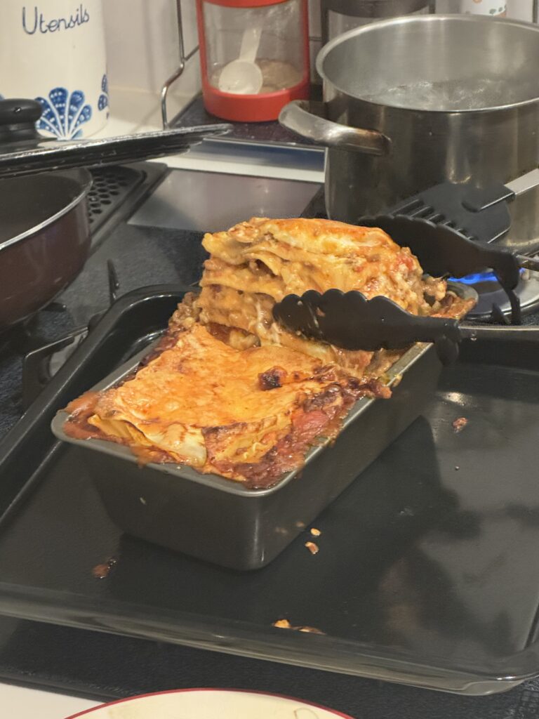 すくうのが大変ですが、8枚のラザニアパスタがミルフィーユ状になり、上の焼けたチーズと一緒に切り分けました