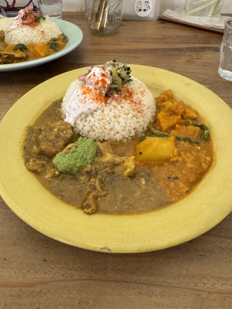 右側が旬野菜のサンバルで、左側が柿とポークのカレーです どちらも良く煮込んであって、とても美味しかったです オーガニックの食材をスパイスと一緒に丁寧に煮込んであるのがわかりました