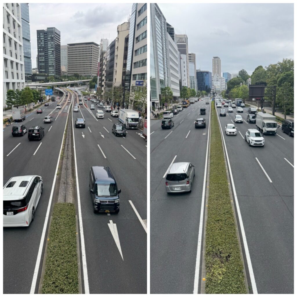 右の写真は246号線下り 右の緑は赤坂御用地 遠くに見える正面のビルは青山一丁目方面です このエリアの青山通りは直線で気持ちのいい道ですね