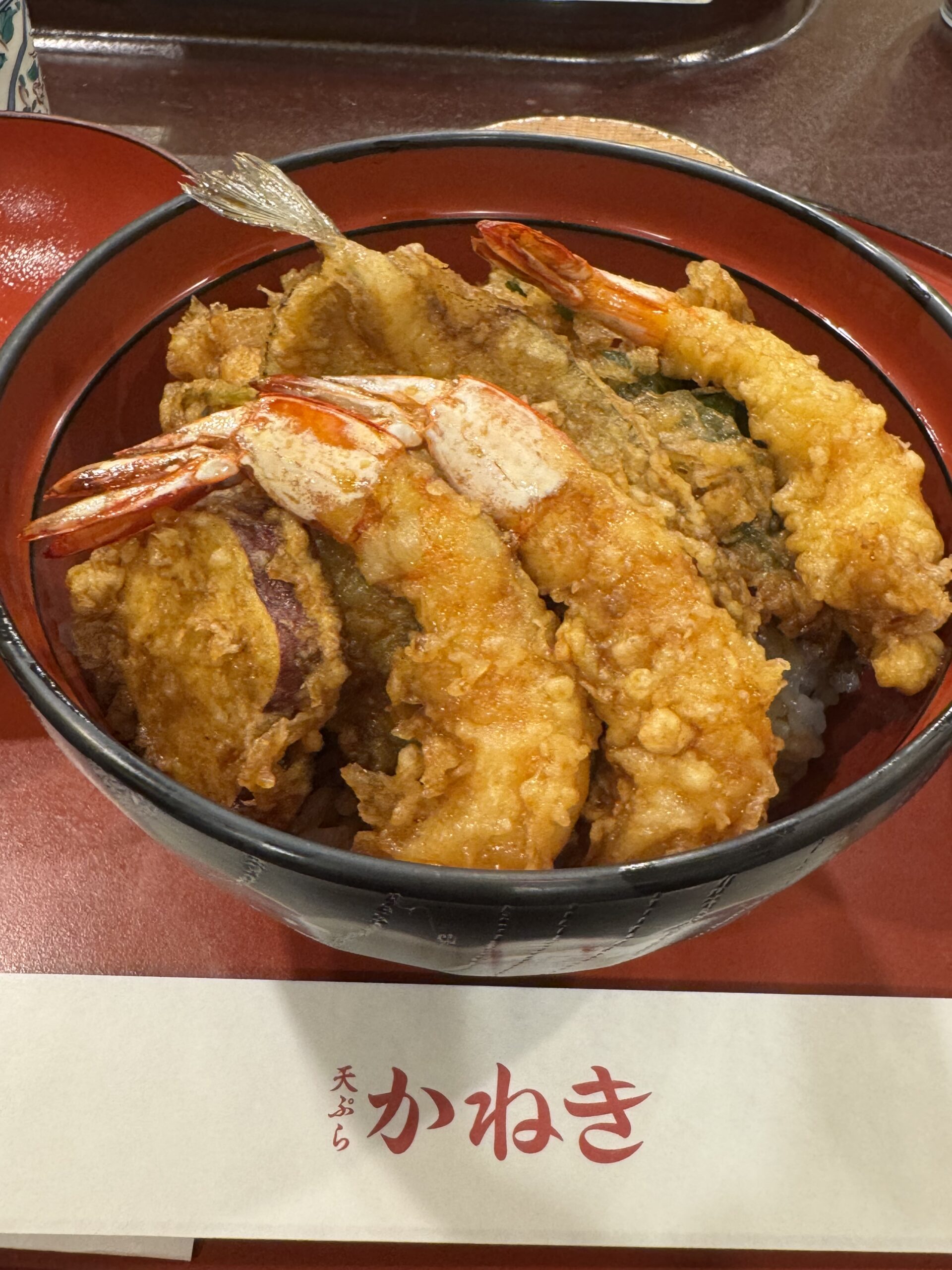 右上 やはり、寿司や天ぷらはカウンターでいただくのが美味しいですね 今日は天丼でしたが、目の前で揚げたものに奥でタレをかけていただくという調理工程でした