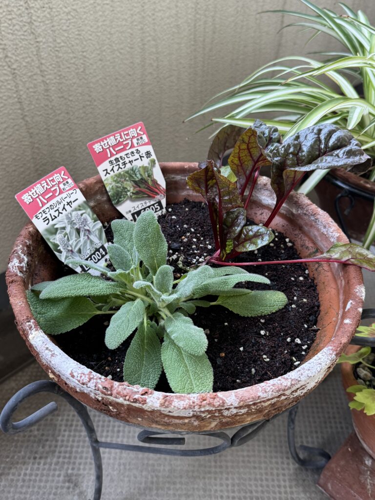 手前がラムズイヤー 耐寒ー10℃と書かれていたので買いました なるほど、これはかなり生命力ありそう 形がたんぽぽに似ているので、かなり強い草であることを直感します