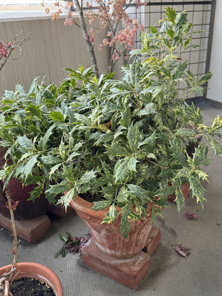 冬になるともみじ等がはを落とすなかで、青々と葉を茂らせている柊の木 鉢からこぼれ落ちそうに茂っていますので、また鉢替えをしてあげないといけないかもしれません