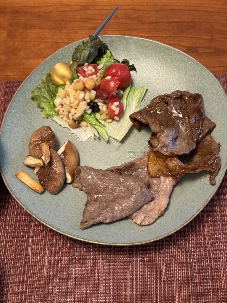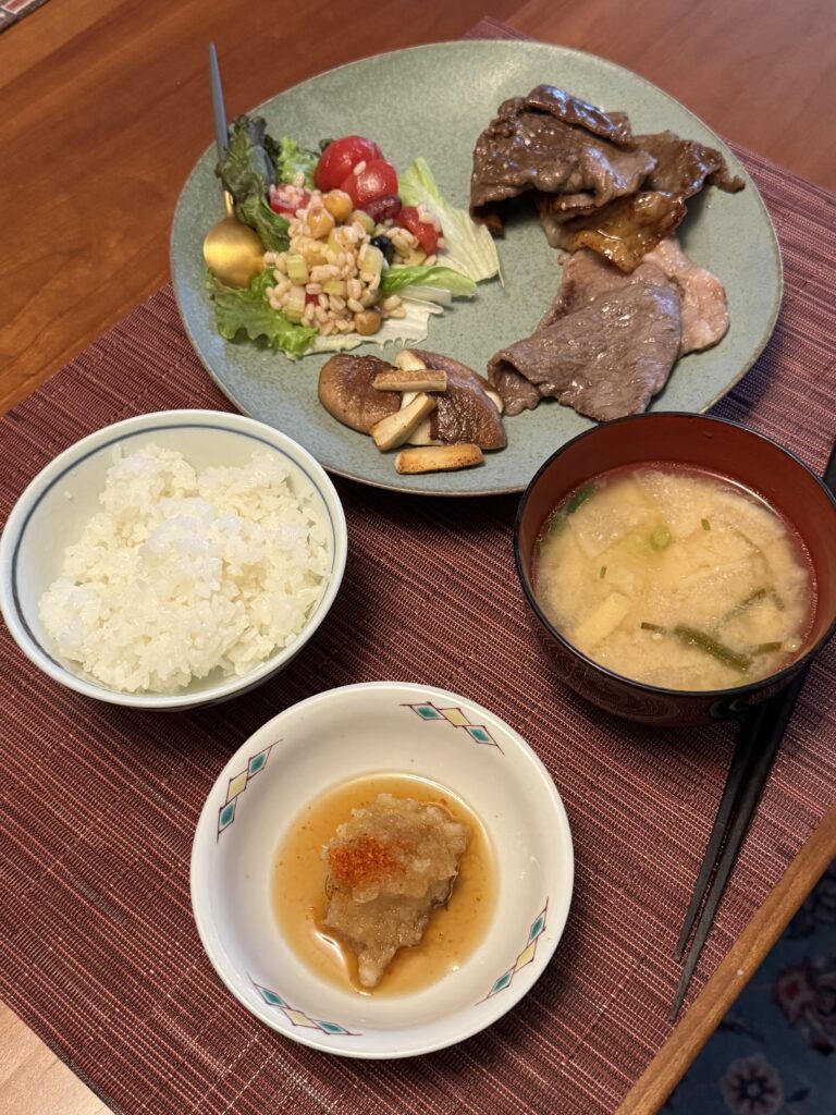 左側が大根おろしで食べる用に塩だけで焼いた肉、右が焼き肉のたれで焼いた肉 牛肉をこんな感じで食べるのは、贅沢な気がしますが、市場に行くとこういういいことができるのだと覚えました!
