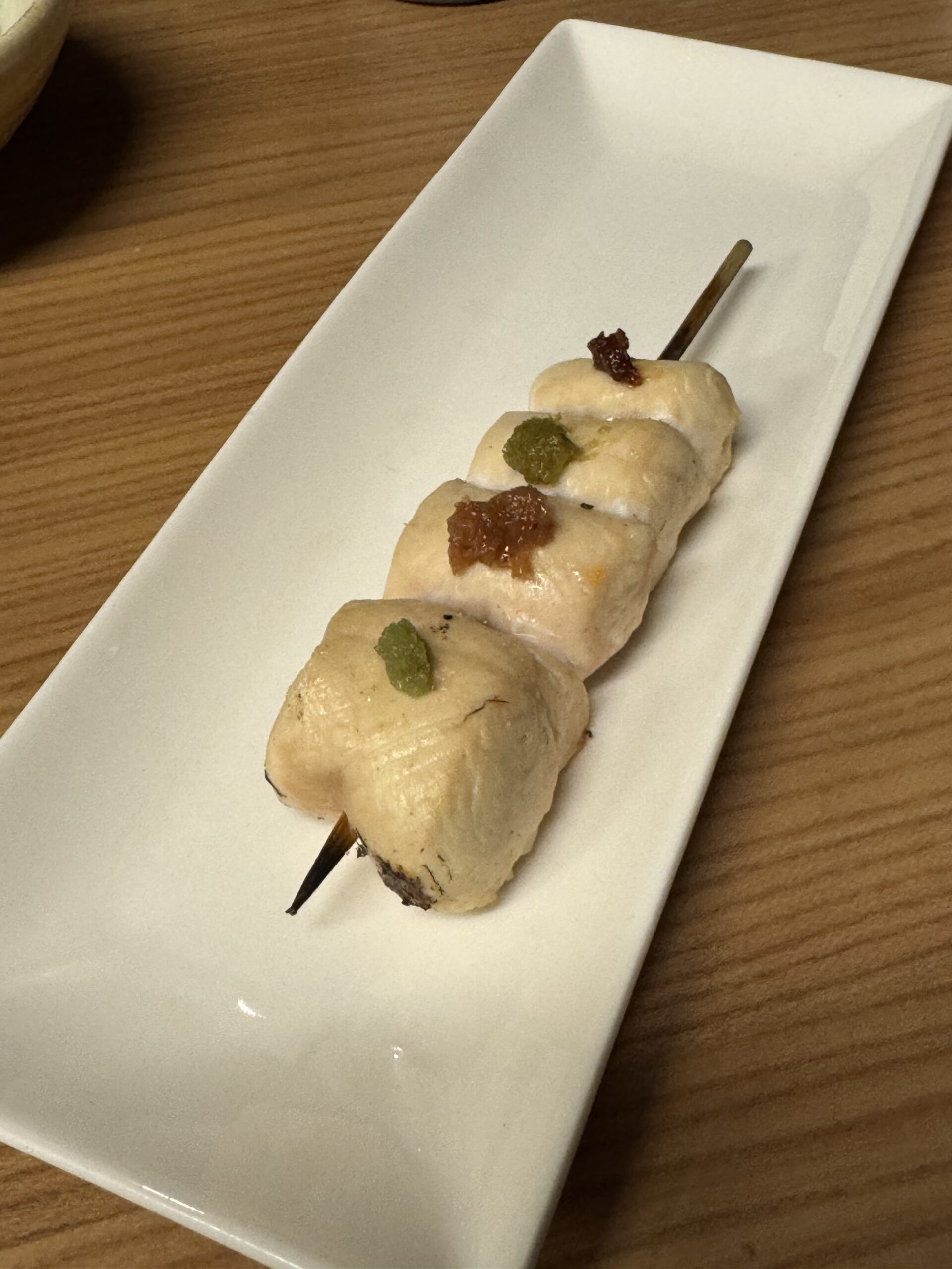 1本目はササミ わさびと味噌の2色仕立て 柔らかく軽い口当たりで始まりました 中はちょっとレアな状態 たたきと同様、焼いた外側と生な内側を楽しめる焼き加減です
