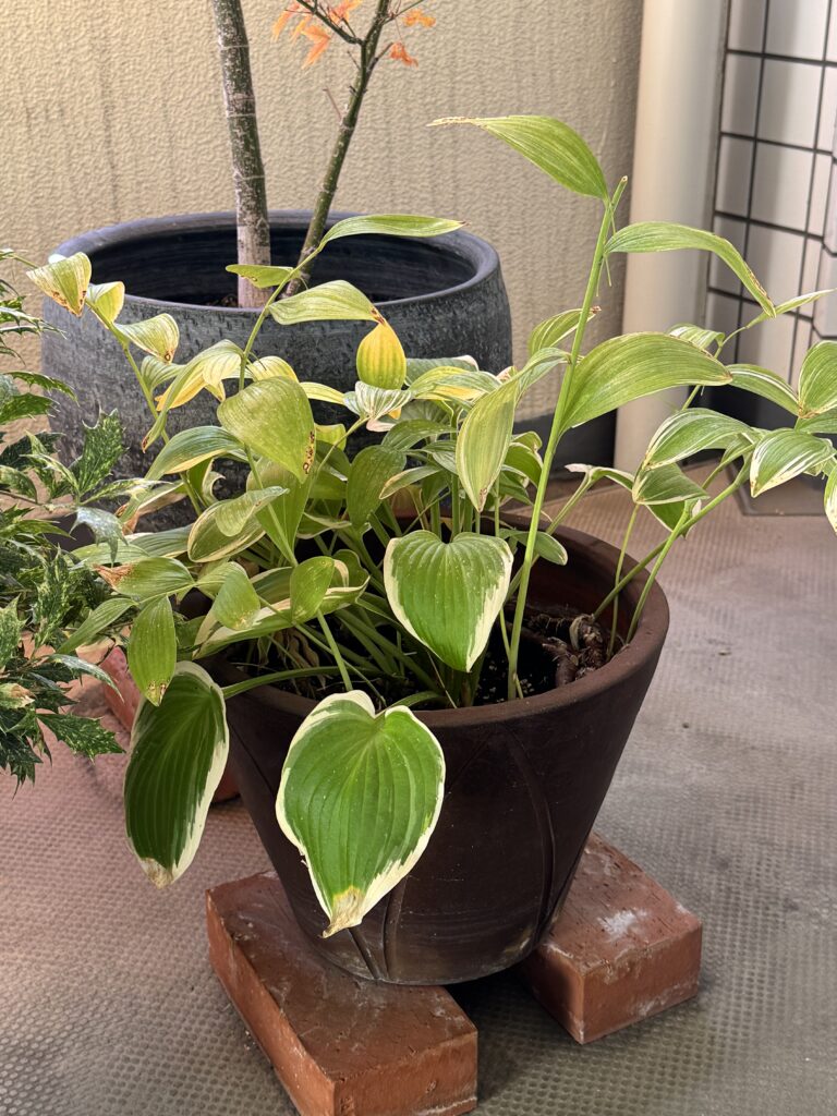 どちらも斑入りの葉でおしゃれな和の植物ですが、今年は、まだ緑色の葉です あと数日で、越年のために葉を落とすと思われます