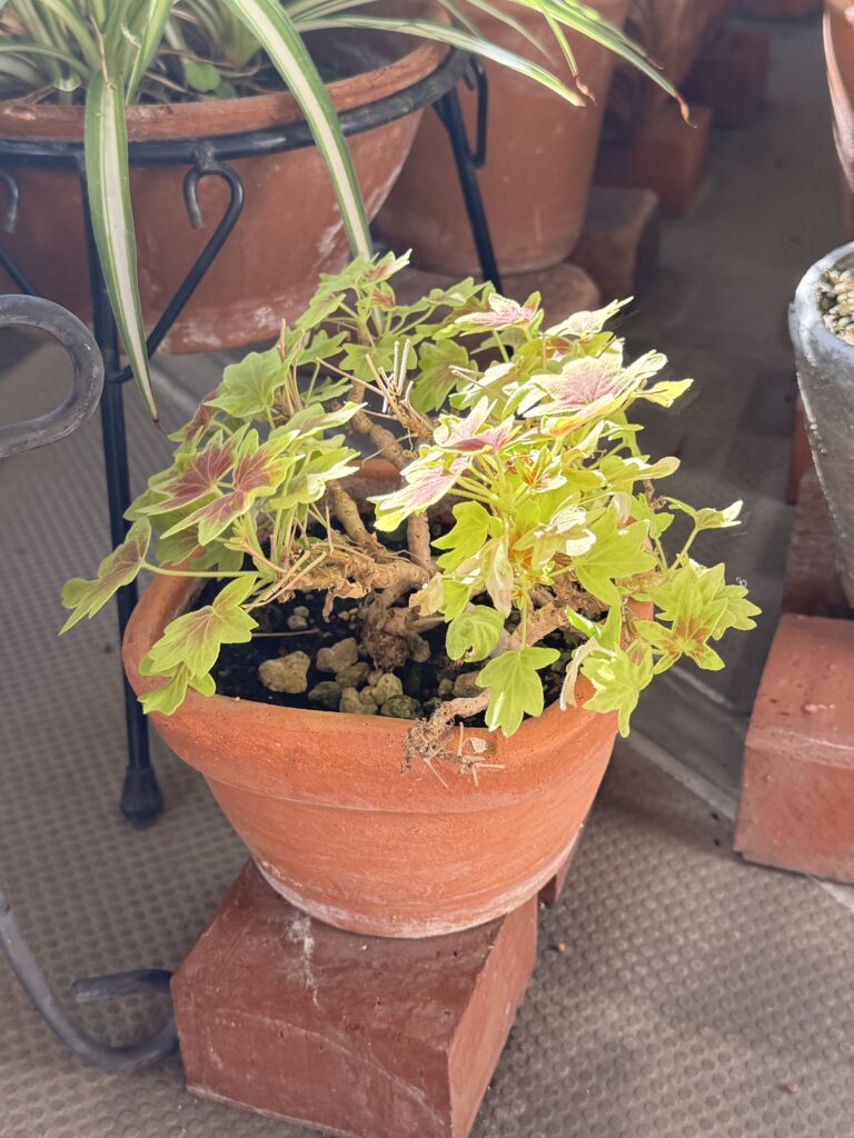 心配して日陰に引っ込めたら、元気を取り戻してまた葉をつけました ゼラニウムも強い植物ですね!