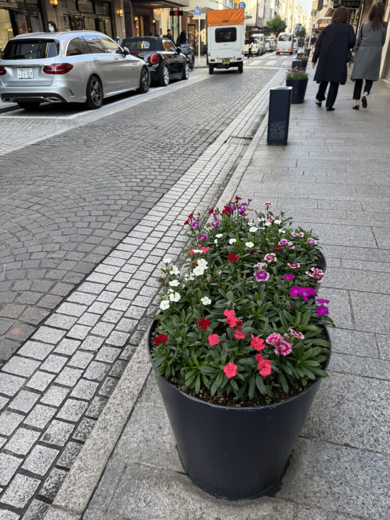 寄せ植えの大ぶりの鉢が等間隔で置かれている元町商店街のメインロード 車道がレンガ敷き風になっていて素敵です