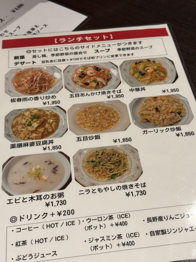 ランチは8つのメニューから選べます とても興味があった板春雨の香り炒めは決めていましたが、もう一つは迷って、中華丼にしました