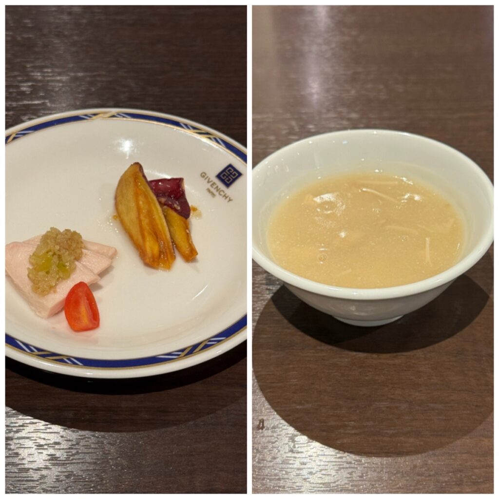 前菜は蒸し鶏と揚げたての芋けんぴ どっちもとても軽い仕上げです