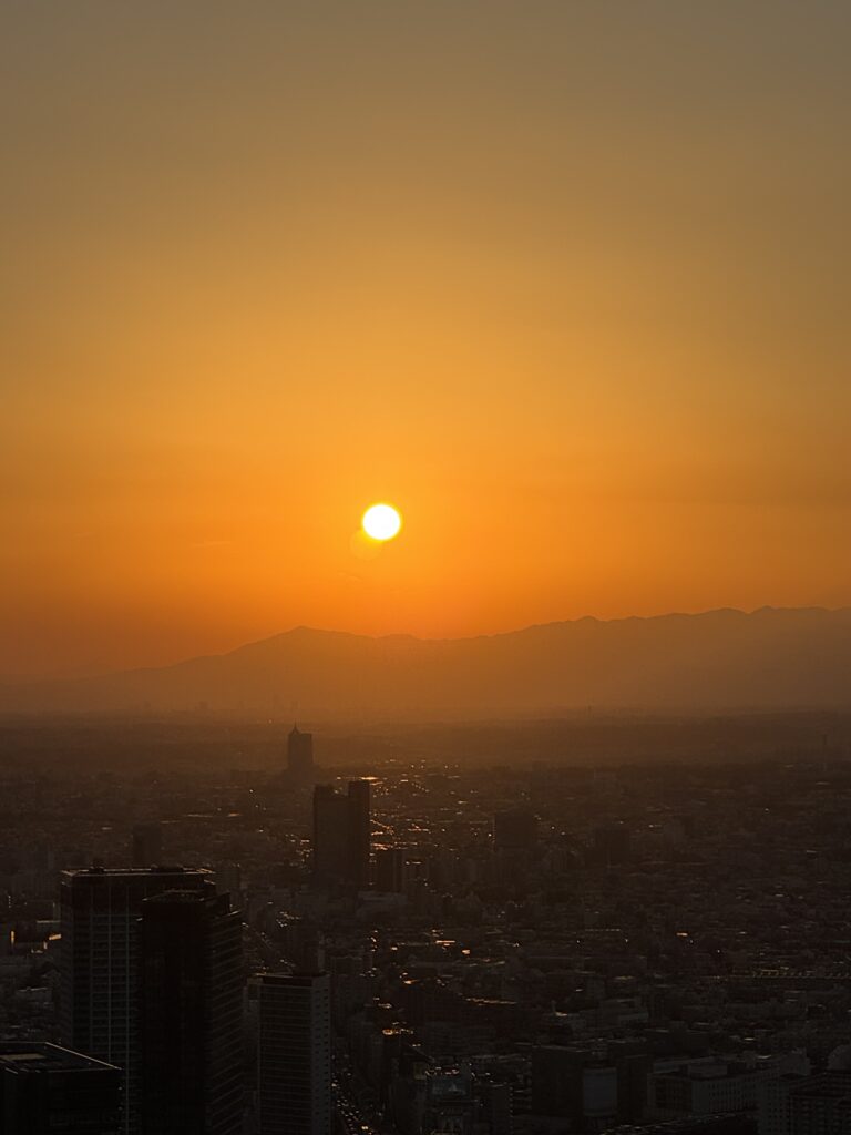 渋谷Sky46Fに到着し手荷物をロッカーに預けて、エスカレーターで屋上に上がったのが16:30ごろ まだ、夕陽が綺麗に見え、太陽が丹沢の山に沈もうとしているところでした