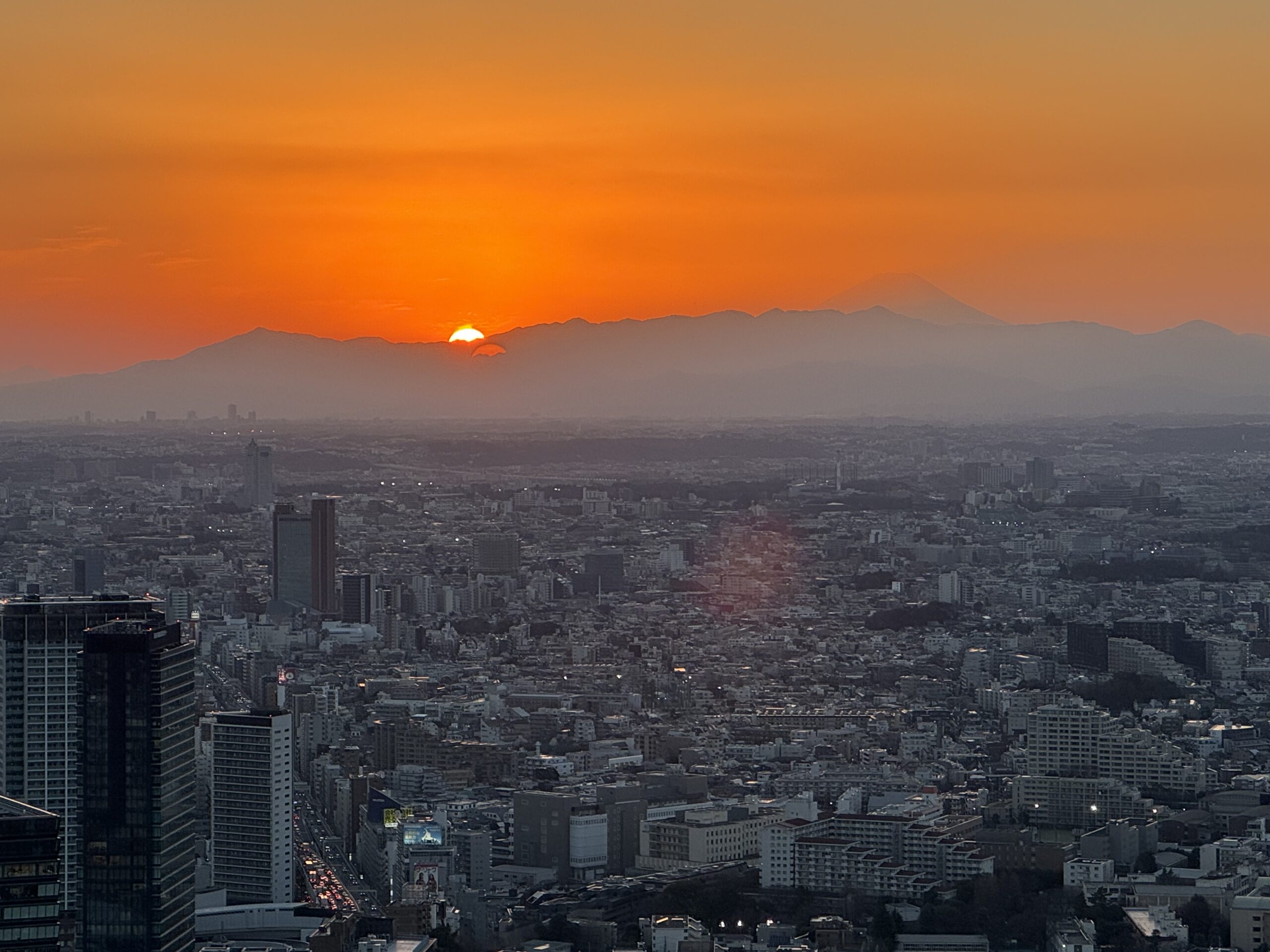 丹沢の山々はくっきり見えるけど、富士山が隠れているようでした しかし、肉眼ではぼんやりと見えるので、陽が沈むタイミングまで待ってみました