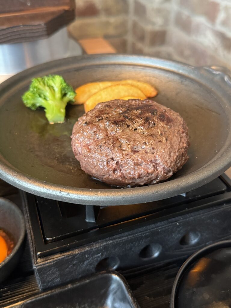 ハンバーグは好みの焼き方で焼いて、黄身をまとわせて食べてもいいし、わさびやオニオンソースで食べてもいいし、どう食べても美味しいです