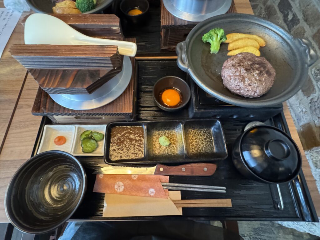 ハンバーグに釜炊きのご飯、黄身とオニオンソース、わさび 右側に味噌汁 左側にはきゅうりの漬物と明太子が供されました