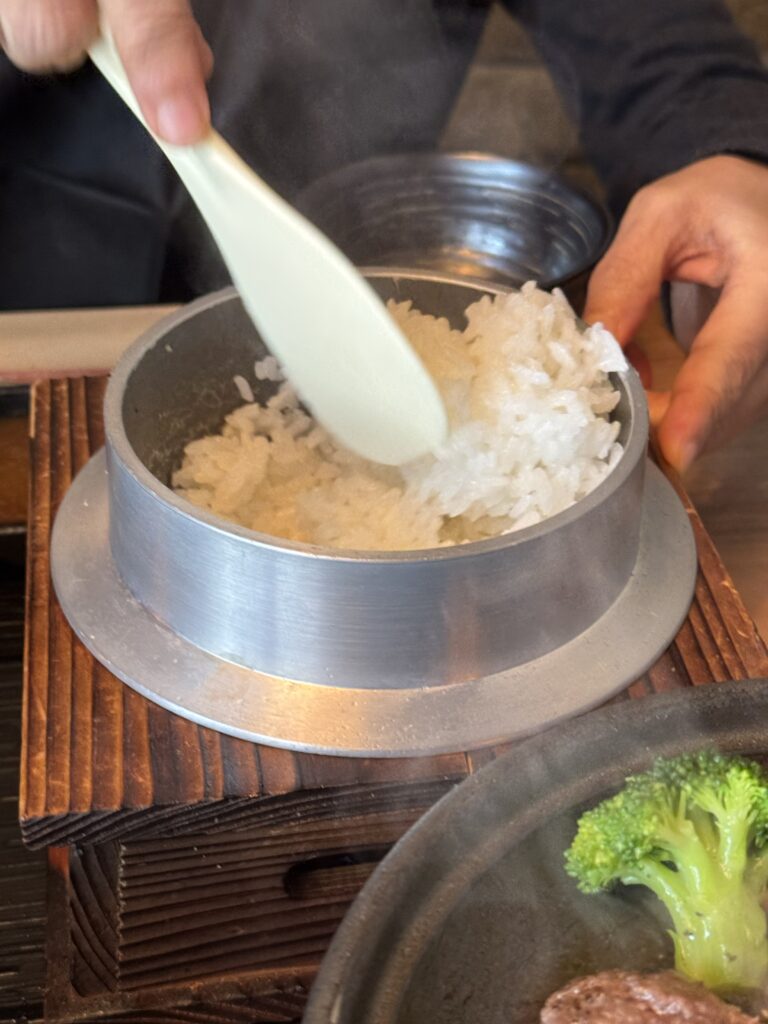 加えて、釜炊きのごはんが絶品 広い席でゆっくり食べられるし、エプロンをつけてテーブルで調理しながら食べられるのは楽しいです