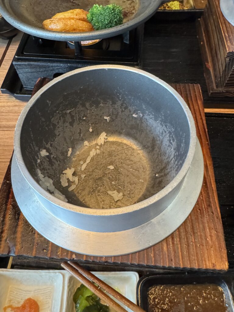 これを焼きながら、ご飯を釜から茶碗によそうのですが、この炊き方が上手くて参りました