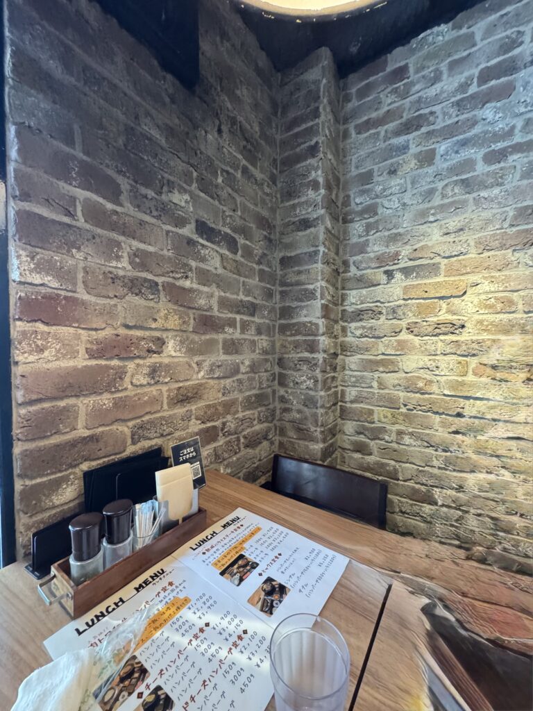 2階に行き引き戸を開けると、奥の席にどうぞと通されました コート掛けにダウンジャケットをかけて座ると、レンガの壁 とても良い感じのお店です