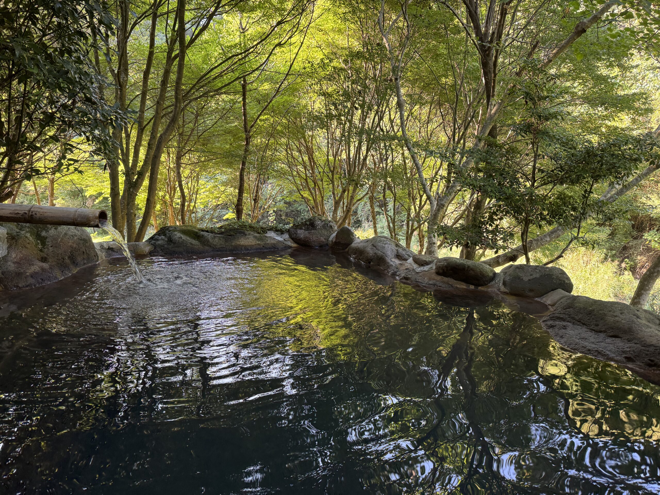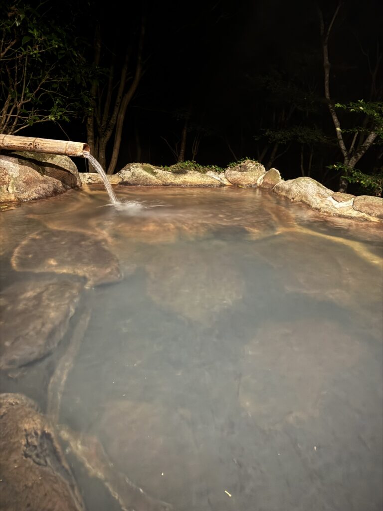 硫黄の匂いがするしじみ汁系の青みがかった濁り湯 湯温はさほど熱くないので、夜明け前のひととき、露天風呂を独り占めにして、いつまでも浸かっていられました