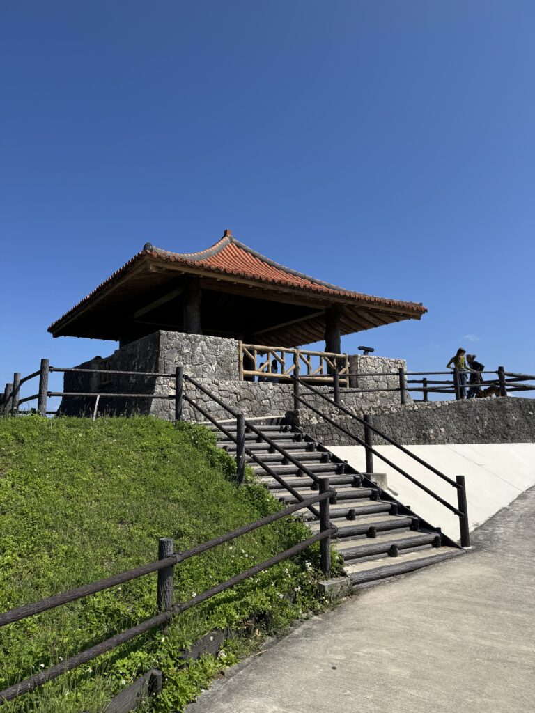 そこに車を停めて、遊歩道を歩くと高台に東屋があります 遊歩道や東屋から西側の海がよく見えました 素晴らしい晴天の午後でした