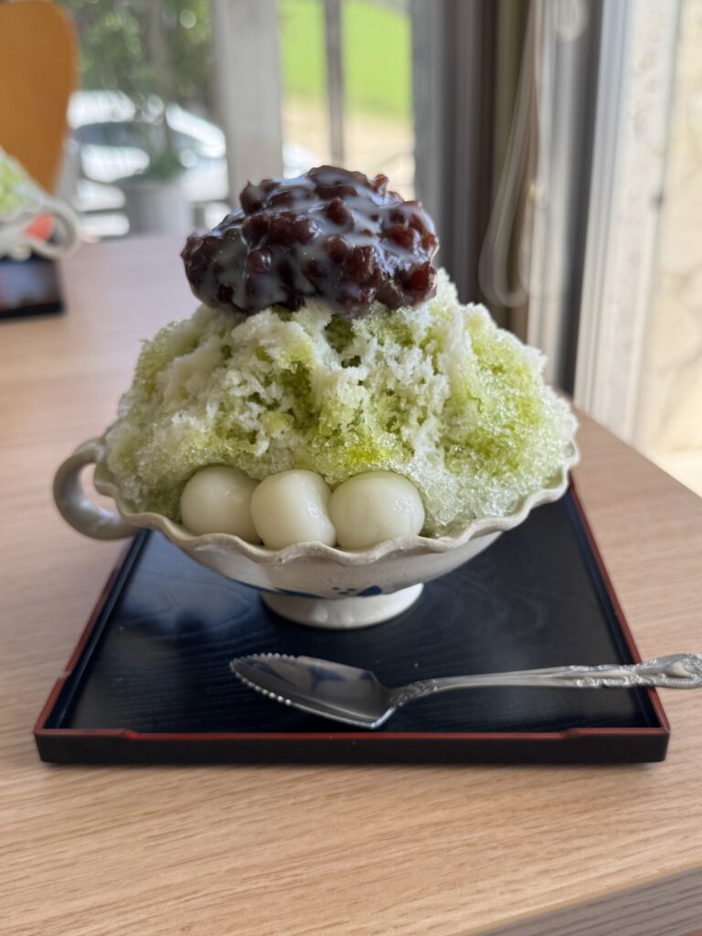 いただいたのは、抹茶味のシロップに小豆と白玉を乗せたかき氷 たしか600円だったと思いますが、やはり東京に比べると物価が安いのでありがたいですね こんな豪華なものが600円で食べられるとは。。。