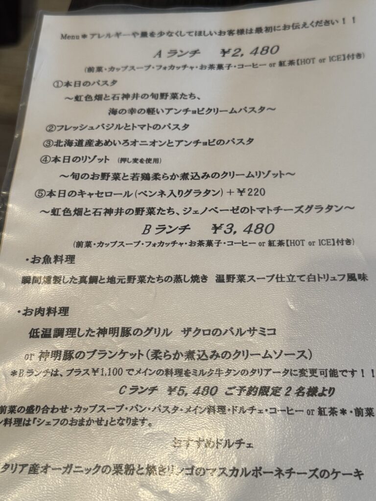 パスタ中心のAランチが2,480円、メイン中心のBランチが3,480円、パスタとメインとデザートのフルコースランチが5,480円