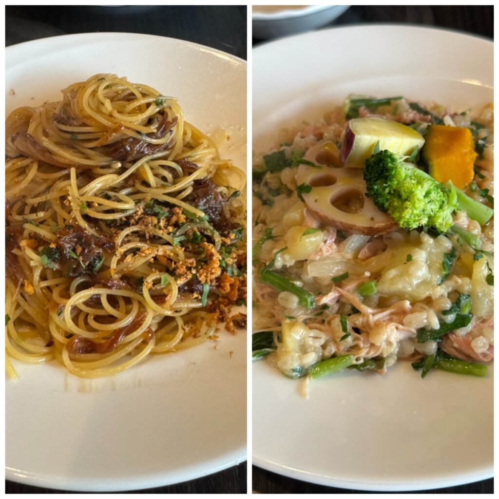 「飴色オニオンとアンチョビのパスタ」と「旬のお野菜と若鶏柔らか煮込みのクリームリゾット」 どちらも最高でした