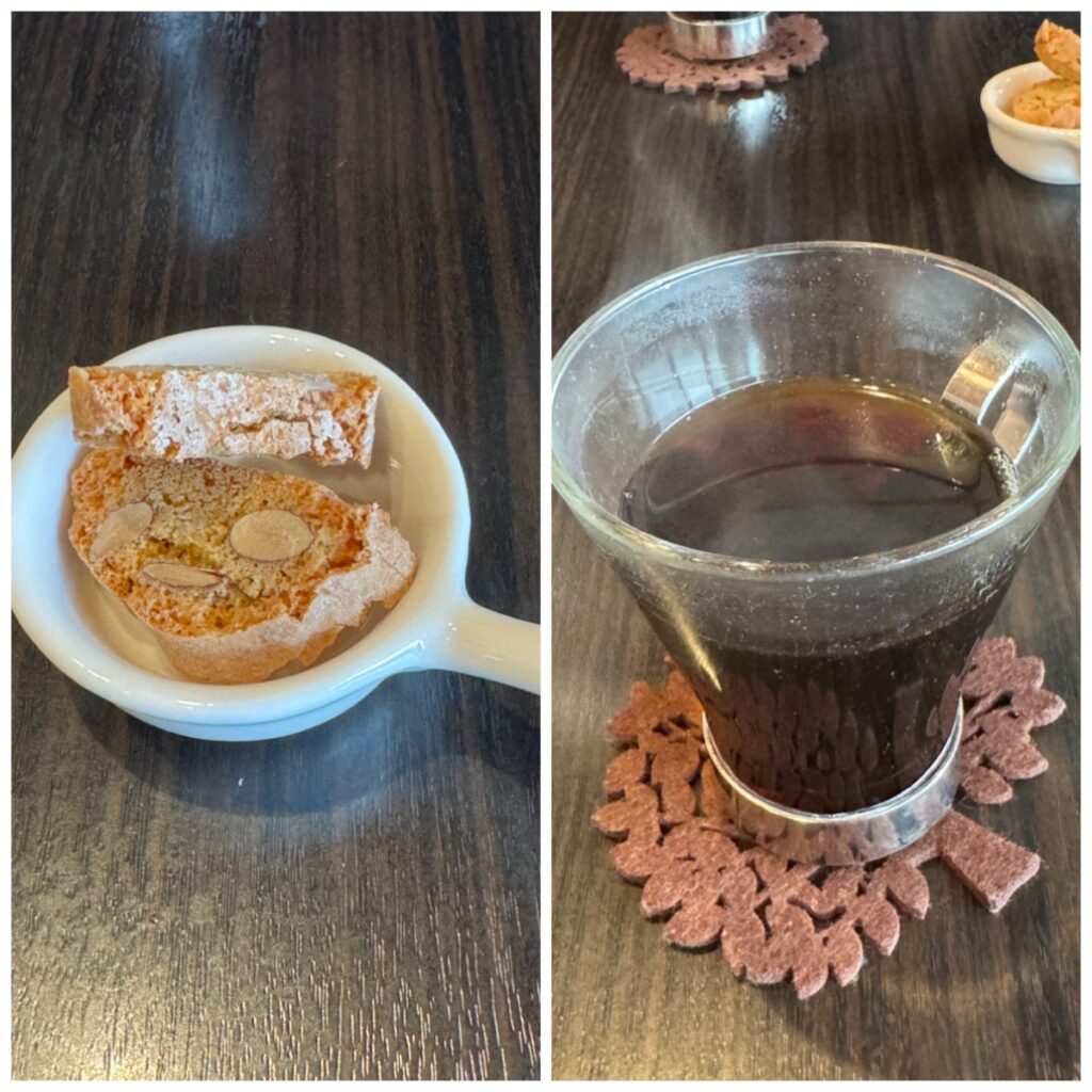 ビスコッティは小さなフライパン状の入れ物に入れて供されました 中のアーモンドが香り、美味しいですね コーヒーはレギュラーコーヒー 少し肌寒くなり、熱いコーヒーが美味しい季節になりました