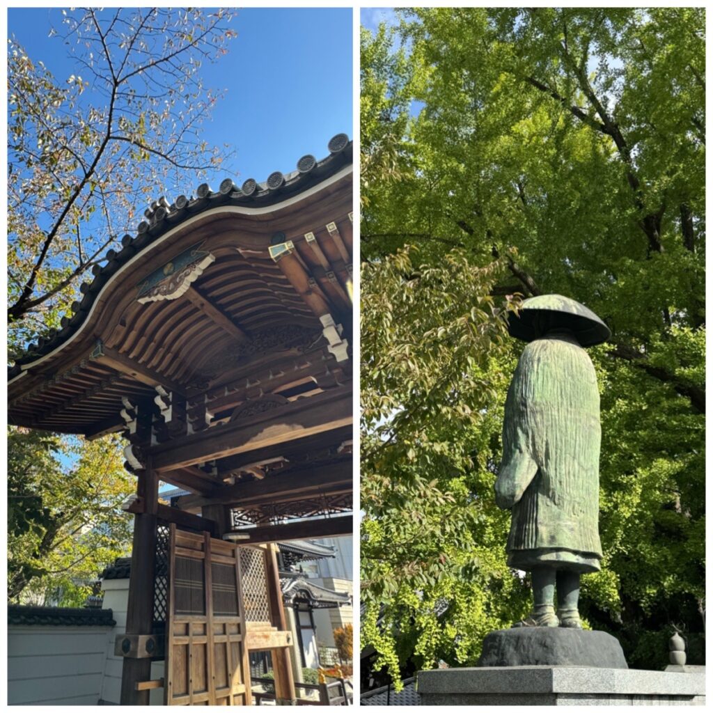 菩提寺である元麻布善福寺の銀杏の木の紅葉が始まっています まだ緑の部分も多くありますが、黄色く色づいた葉が落ちていて、今日は落ち葉の片付けの作業を行なっておられました