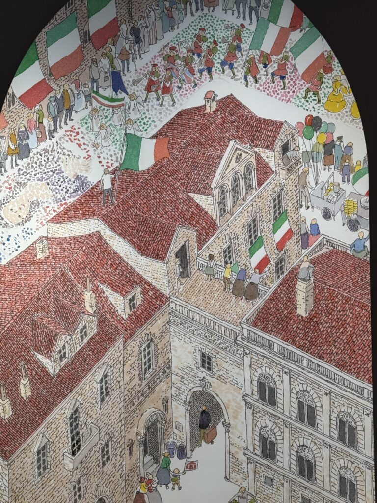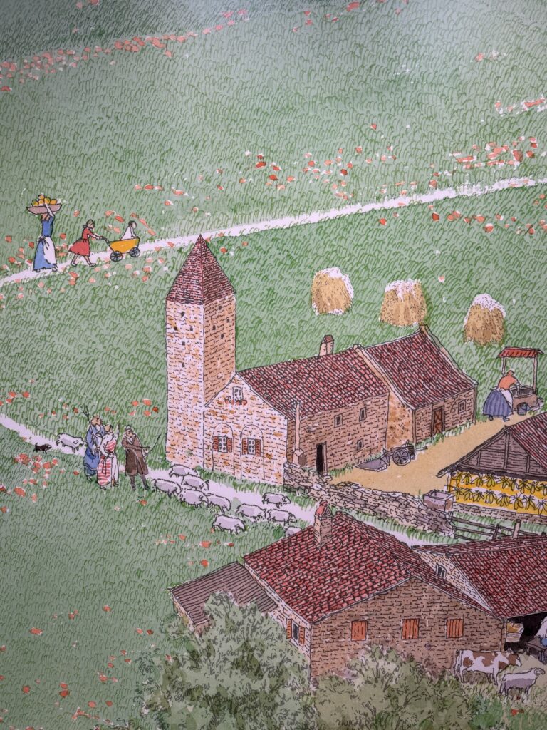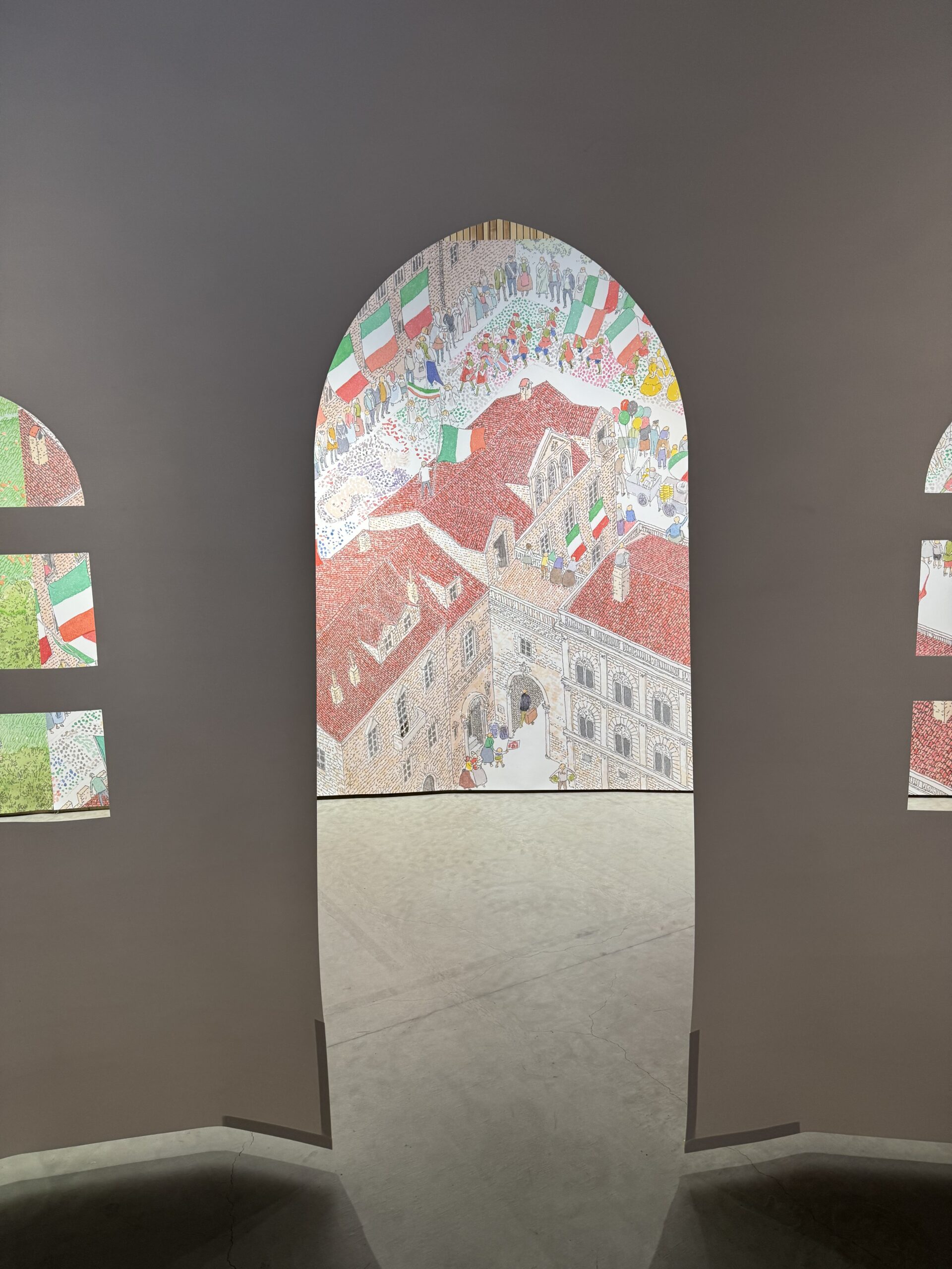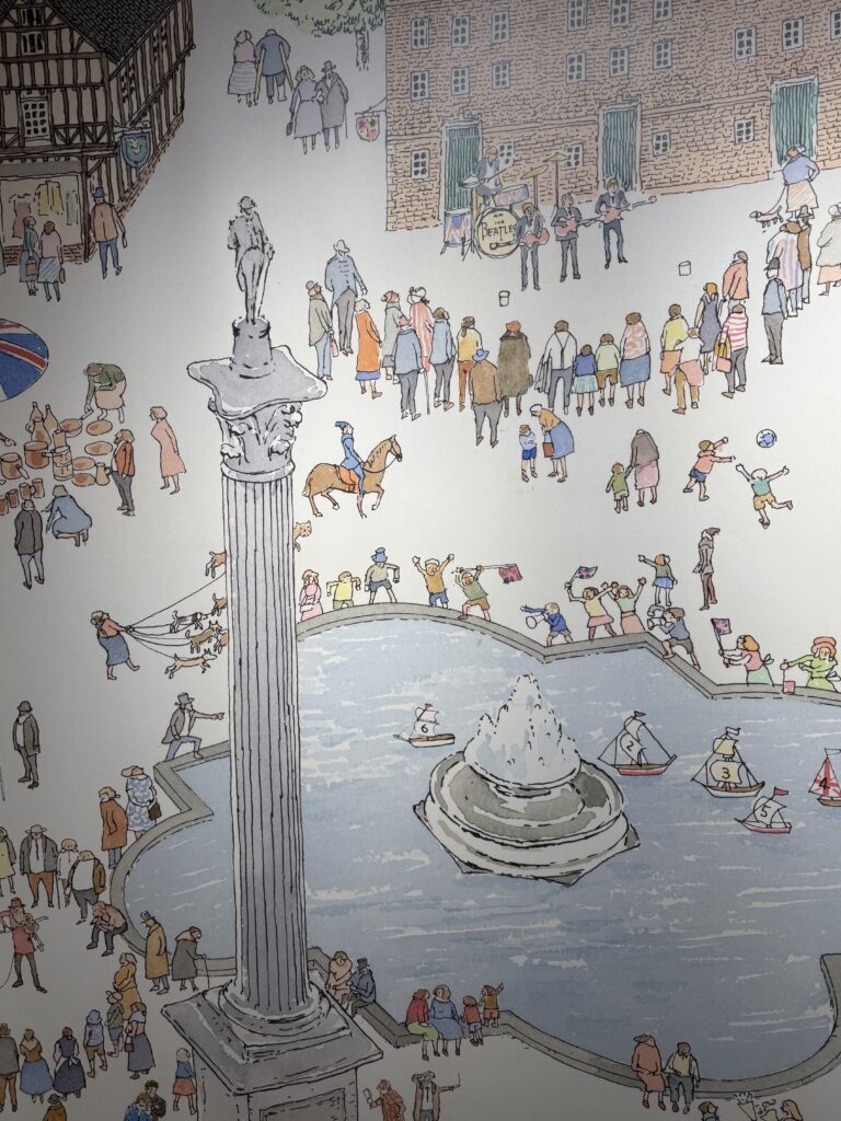 中央に描かれている青い三角帽子を被った旅人がいろんなところを旅する風景が描かれていて、構図が上手いなあと思いながら見ました