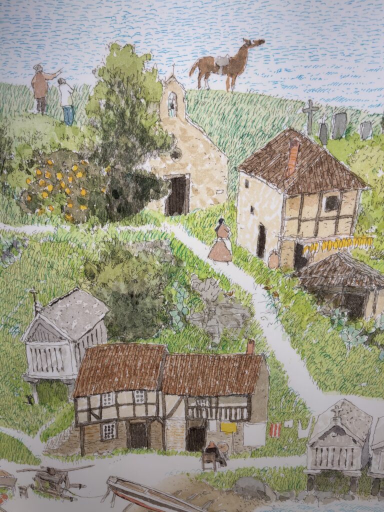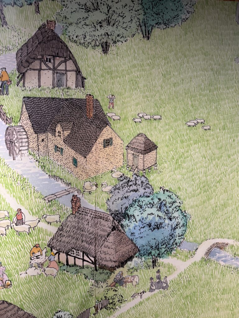 この絵の左上画角が切れているところに、三角帽子の旅人がいます イギリスの田舎を描いた絵 コッツウォルズとか、まさにこんな感じです!