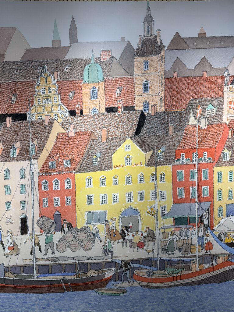 コペンハーゲンの港町が描かれています 街並みがいかにも北欧 建物の描き方がとても上手いなあと思います