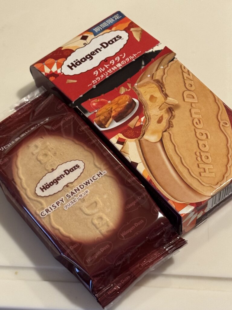 ハーゲンダッツのクリスピーサンド、美味しいですね 食事がヘルシーだったので、デザートを少しリッチ(クリスピーサンドの半分)にしました