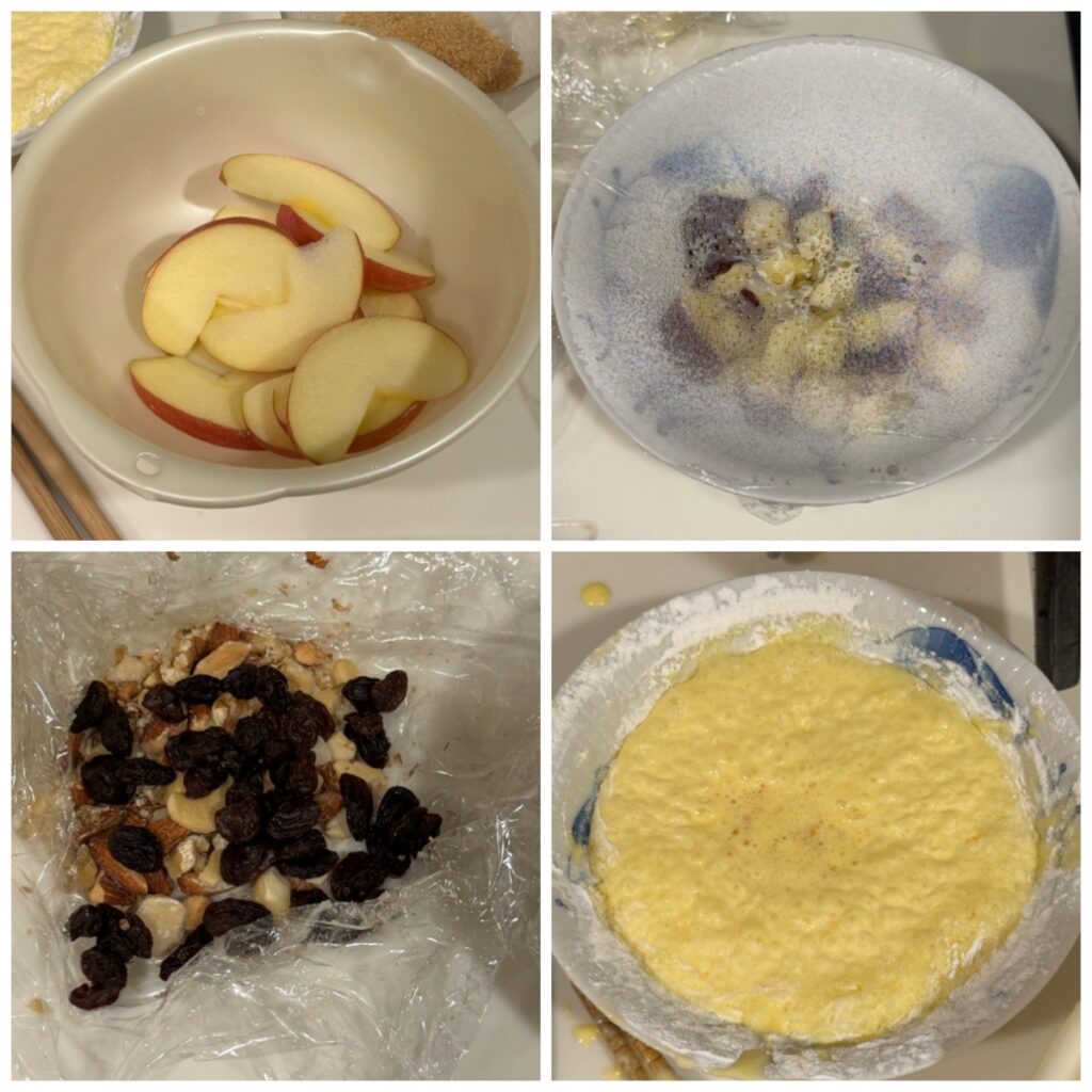 今年は、りんご🍎、干し葡萄、砕きナッツに加えて、サイコロ状に切ったさつまいもを入れました 自然な甘さのさつまいもが加わり、美味しいピザが出来上がりました