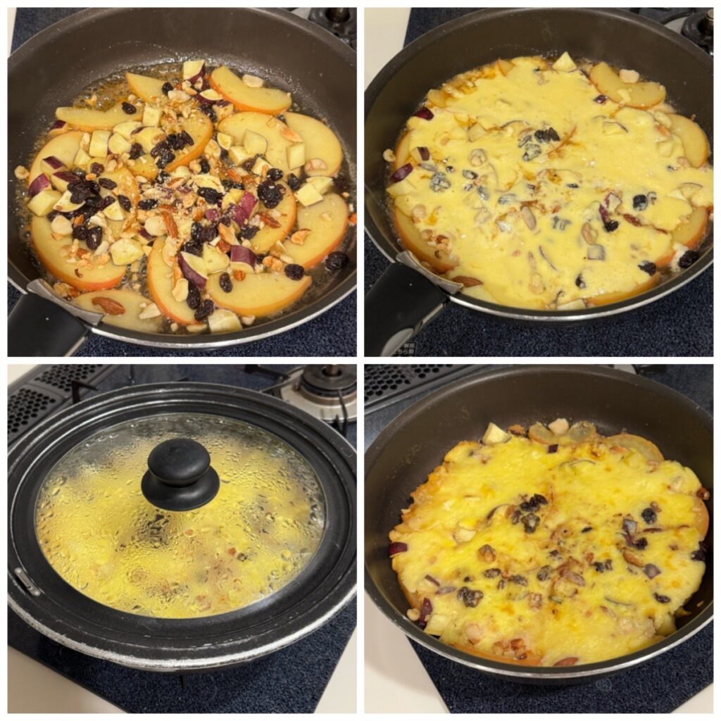 左上 薄く切ったりんごは両面をバター+水+砂糖で炒めます しなっとなったら、砕いたナッツや干し葡萄を加えます