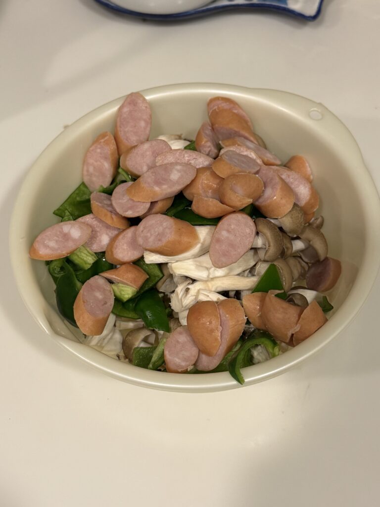 小玉ねぎx1を薄切りにして、ピーマン4ケを乱切りに しめじが半分残ってたのでこれはレシピ外だけど入れました ソーセージを5本斜め切りに