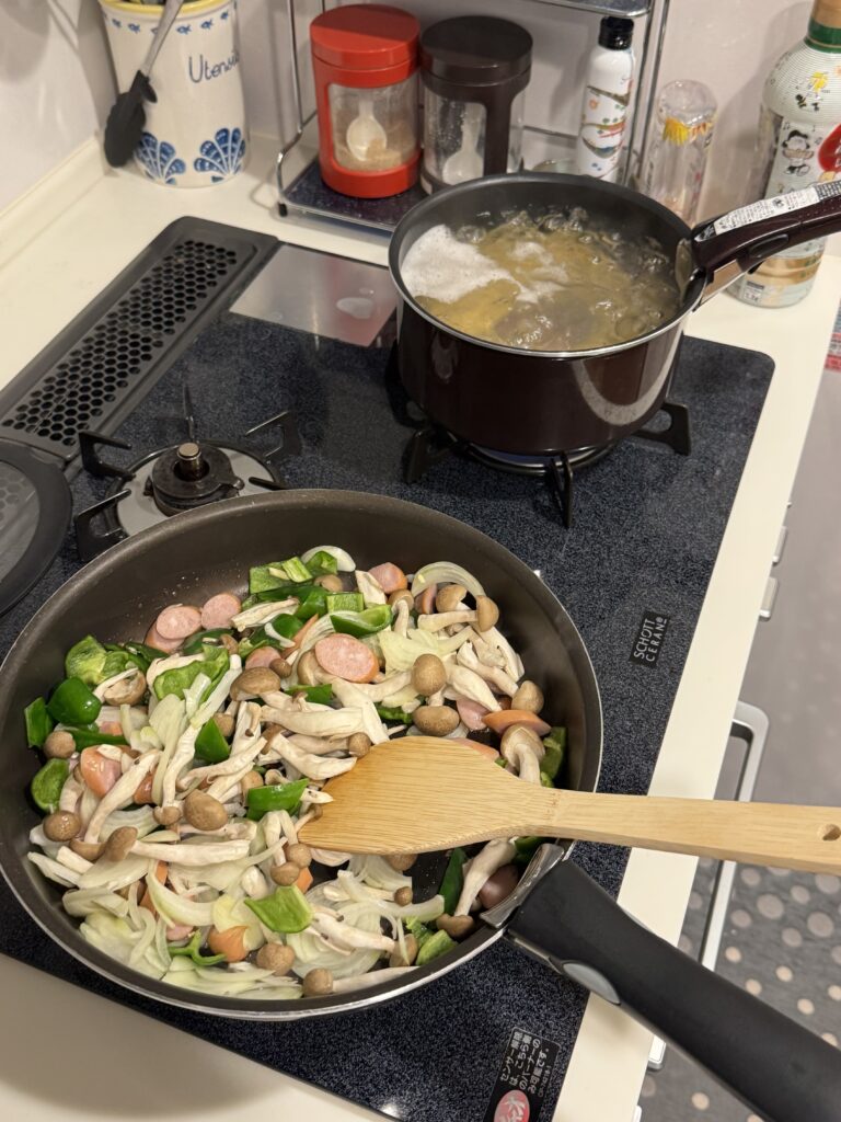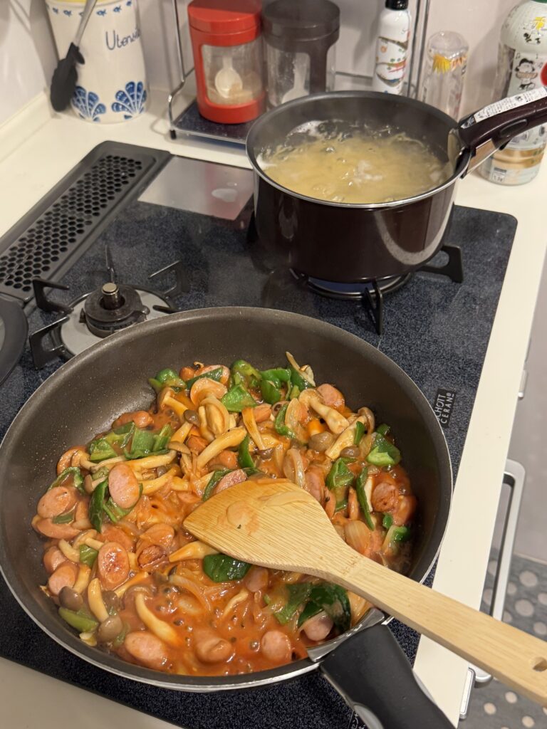 画像で見るとこんな感じです 湯が沸騰したらパスタを茹で始め、タイマーを8分に設定したらナポリタンの材料を炒め始めます