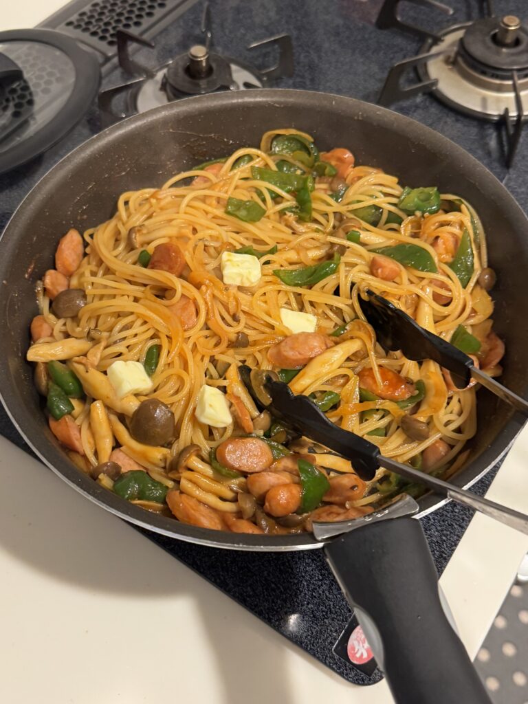 麺をフライパンに入れたらバターを入れて、具材と絡めながらよく溶かします